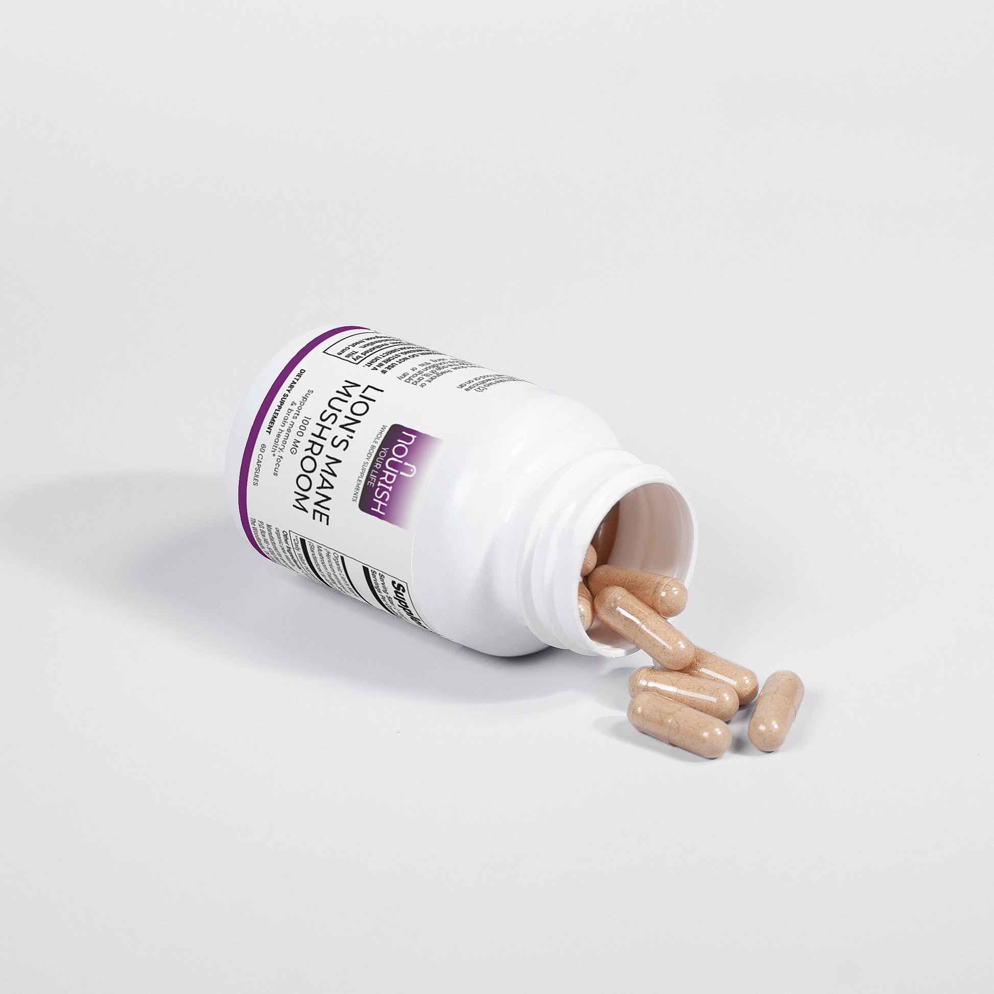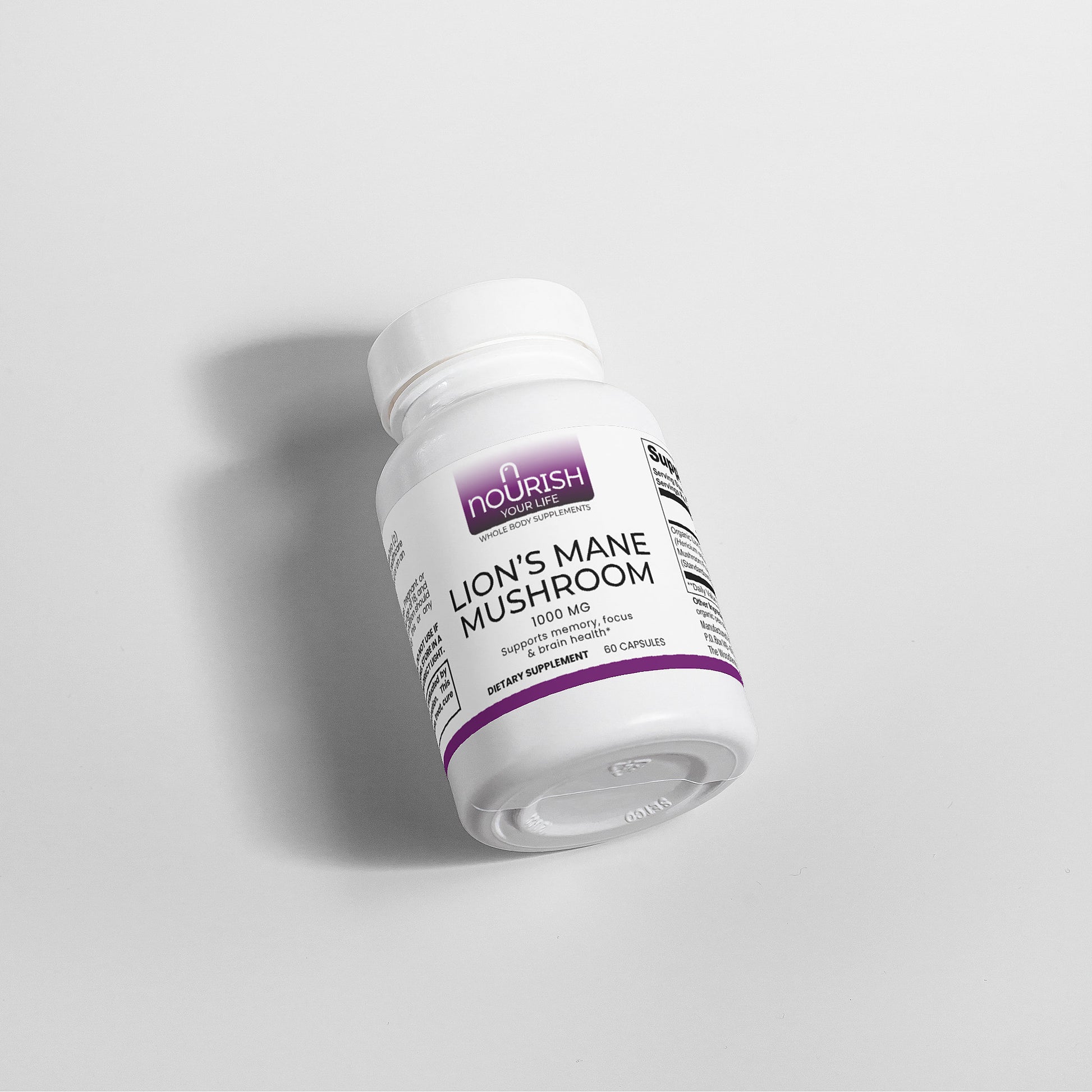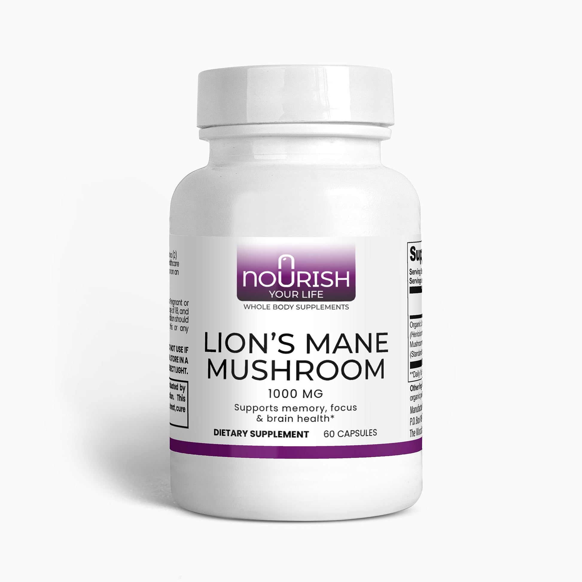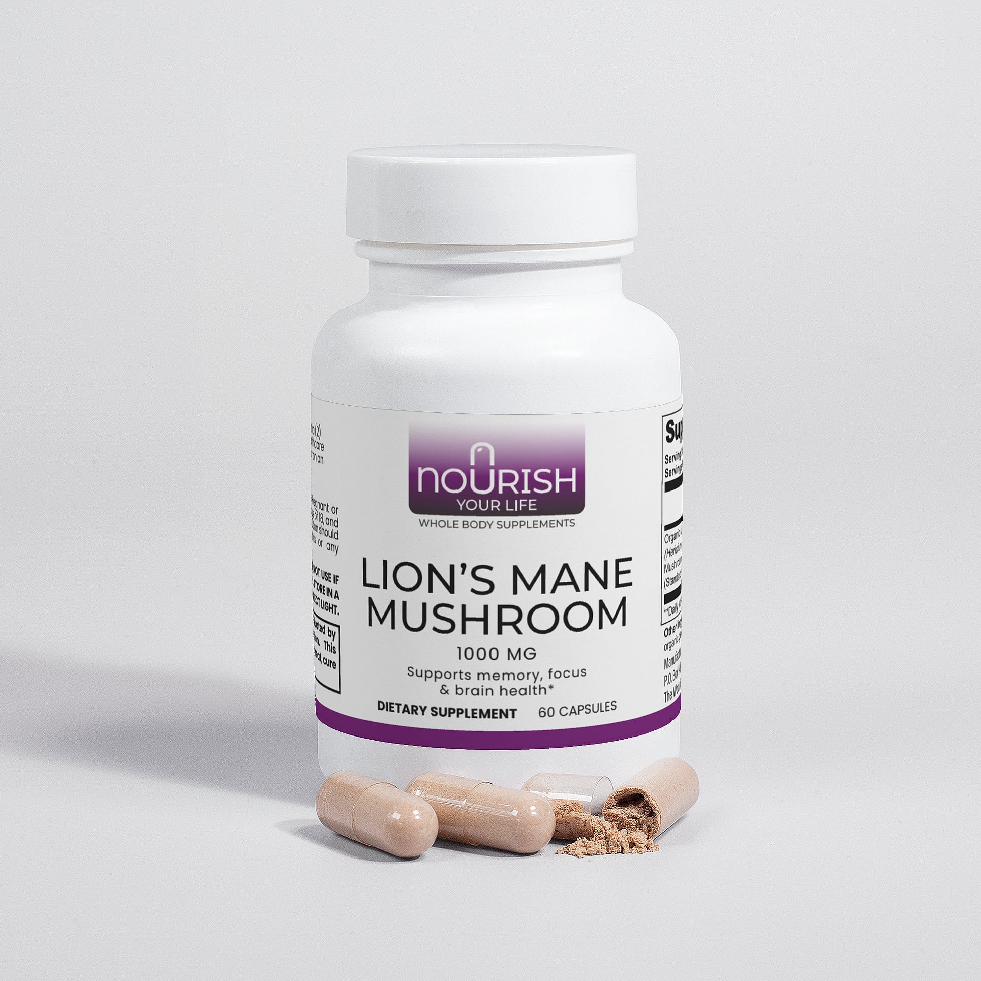 Ingredients: Organic Lion’s Mane (Hericum erinaceus) Mushroom Fruiting Body & Mycelium Powder (Standardized to 40% polysaccharides [400mg]), Organic capsule (pullulan, water), organic pea starch.