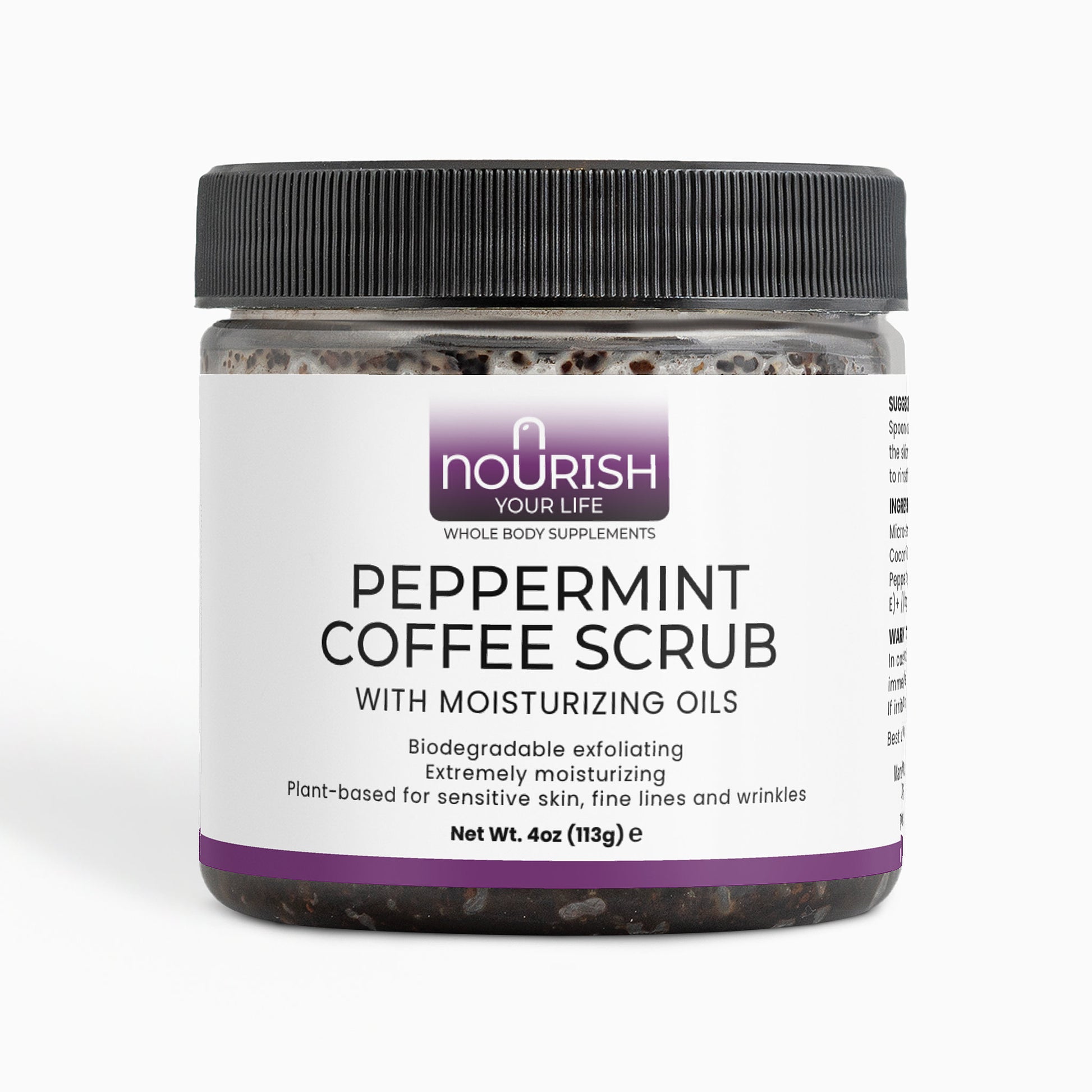 Ingredients: Micro-Roasted Coffee*+, Brown Sugar*+, Coconut Oil*+, Castor Oil*+, Sea Salt, Peppermint Essential Oil*, Tocopherol (Vitamin E)+ // *Organic +Food-Grade
